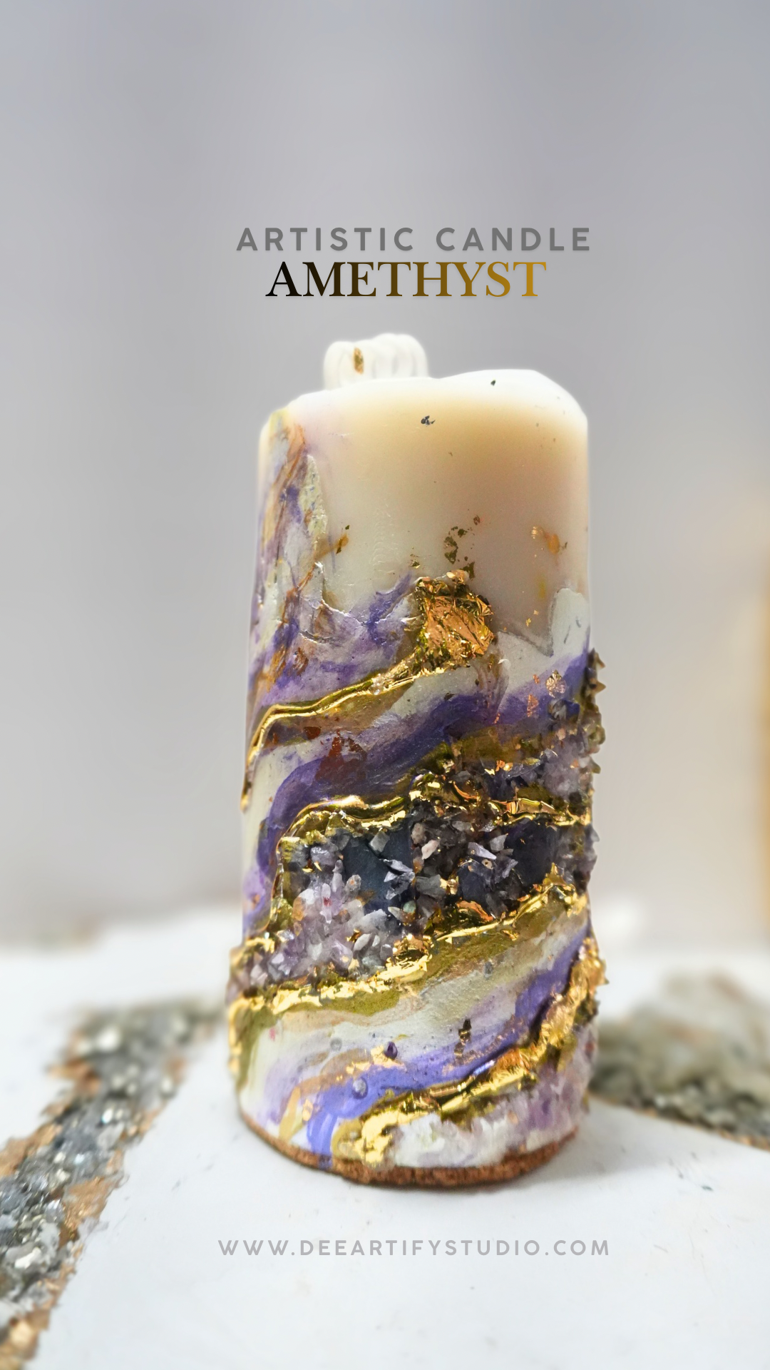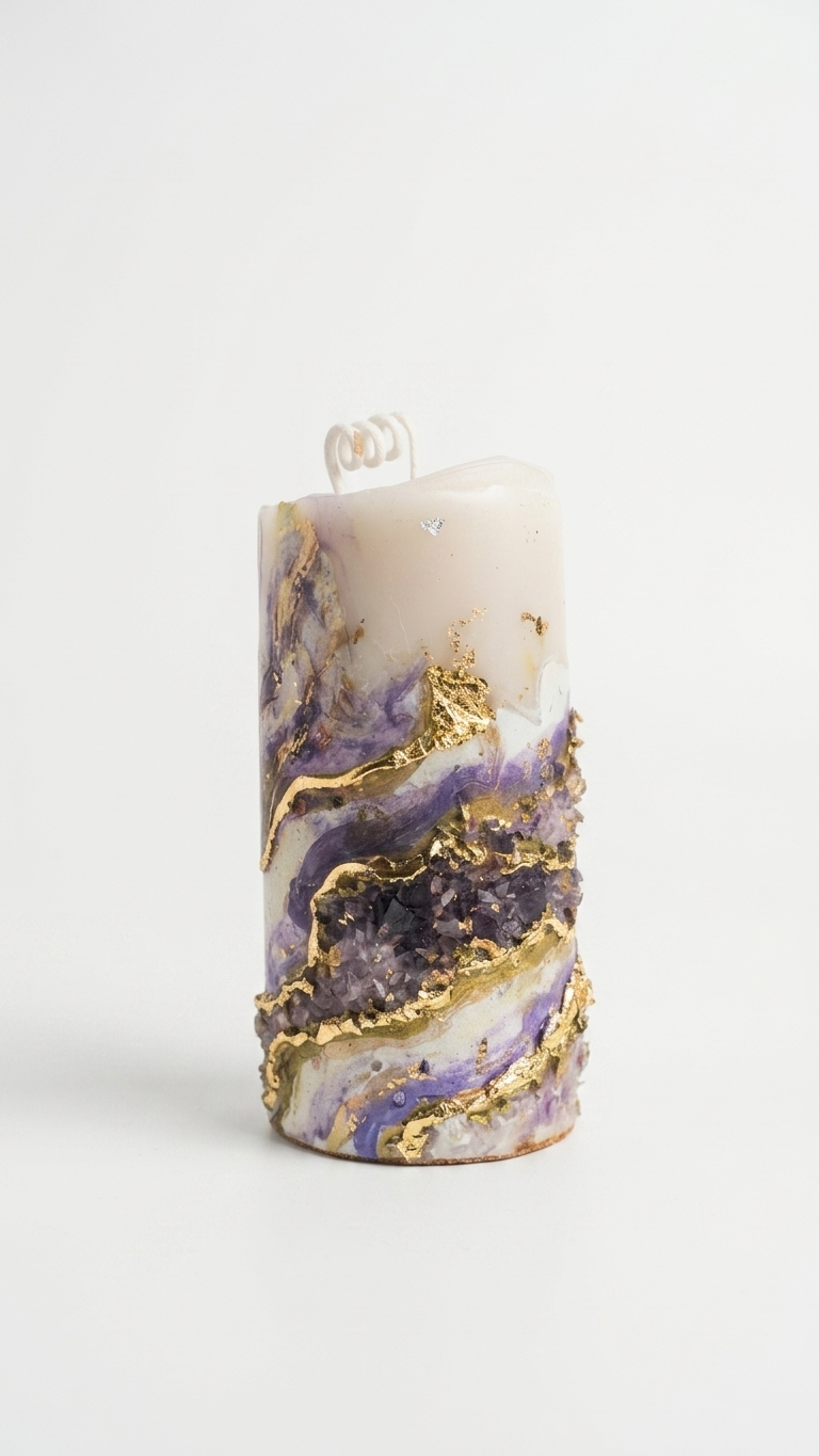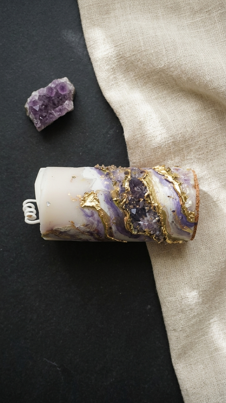 This handcrafted amethyst geode candle is a fusion of sculptural art and functional luxury. Designed to replicate the raw beauty of natural crystal formations, it features layered textures, crushed crystal detailing, and fluid violet tones flowing through a soft ivory base. Each piece is individually finished with delicate gold foil accents, adding depth, richness, and a refined metallic contrast.