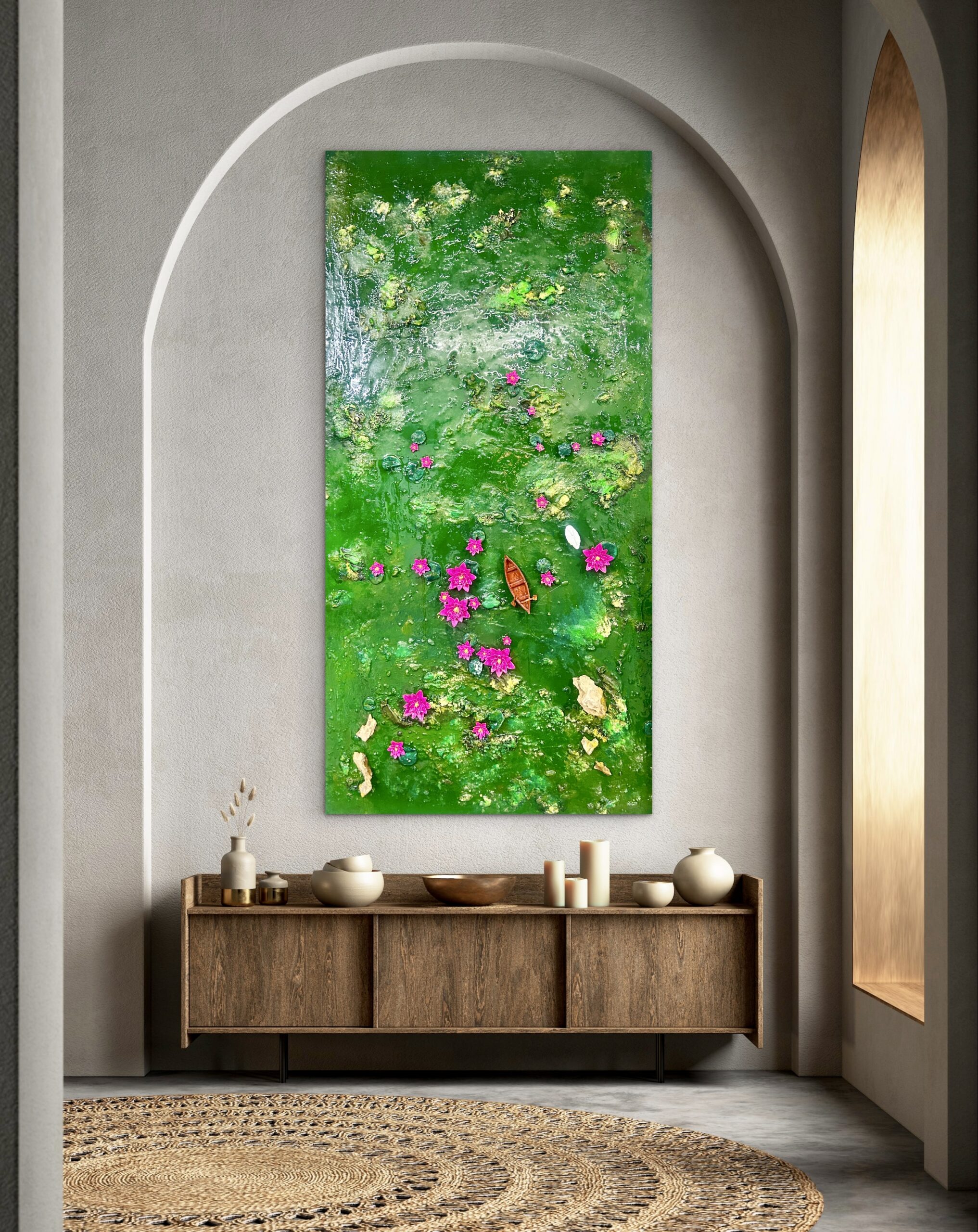 Blooming lotus flowers, tranquil waters, and handcrafted 3D textures come together to create a luxurious statement piece that brings peace, depth, and elegance to your space.