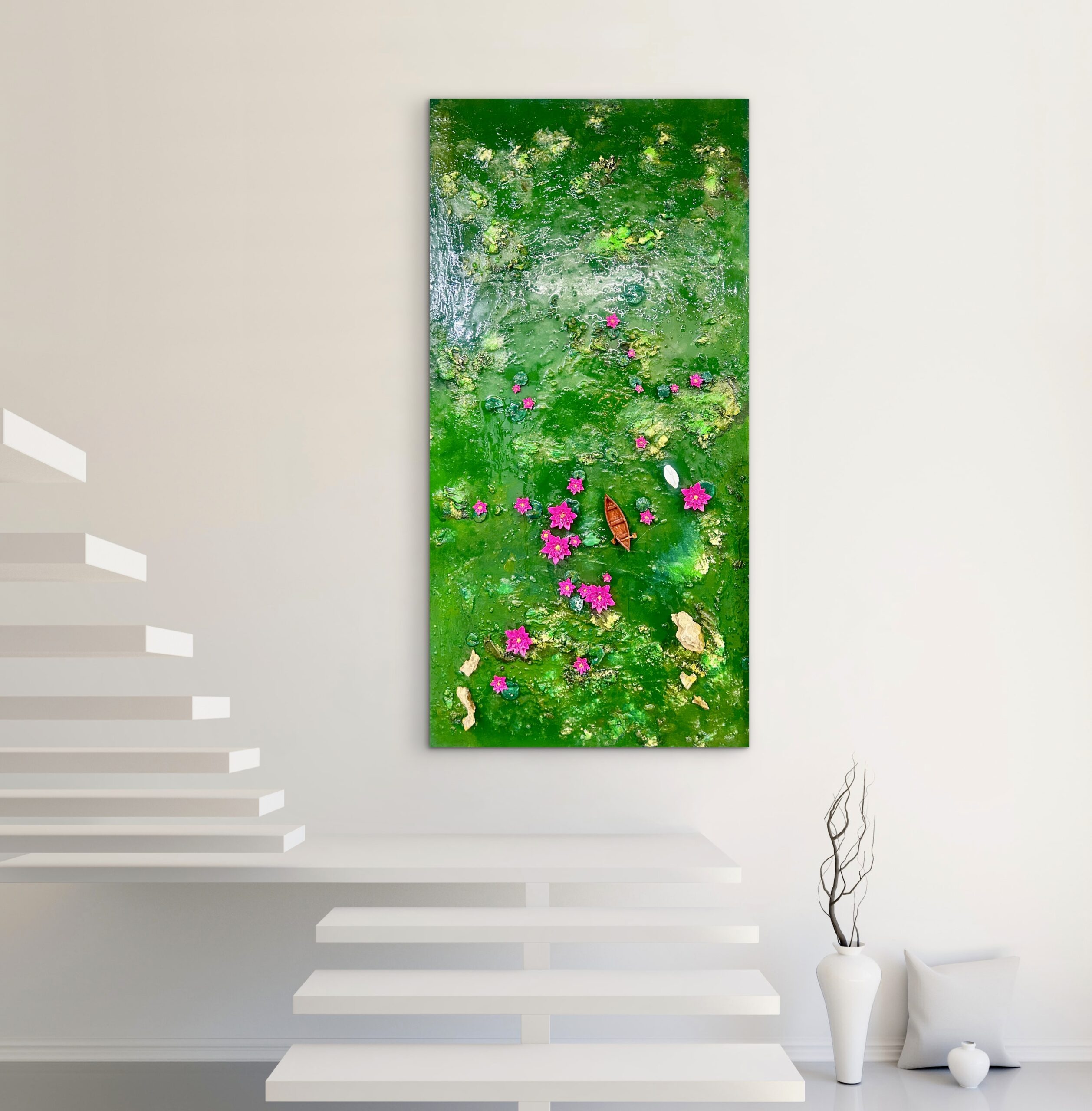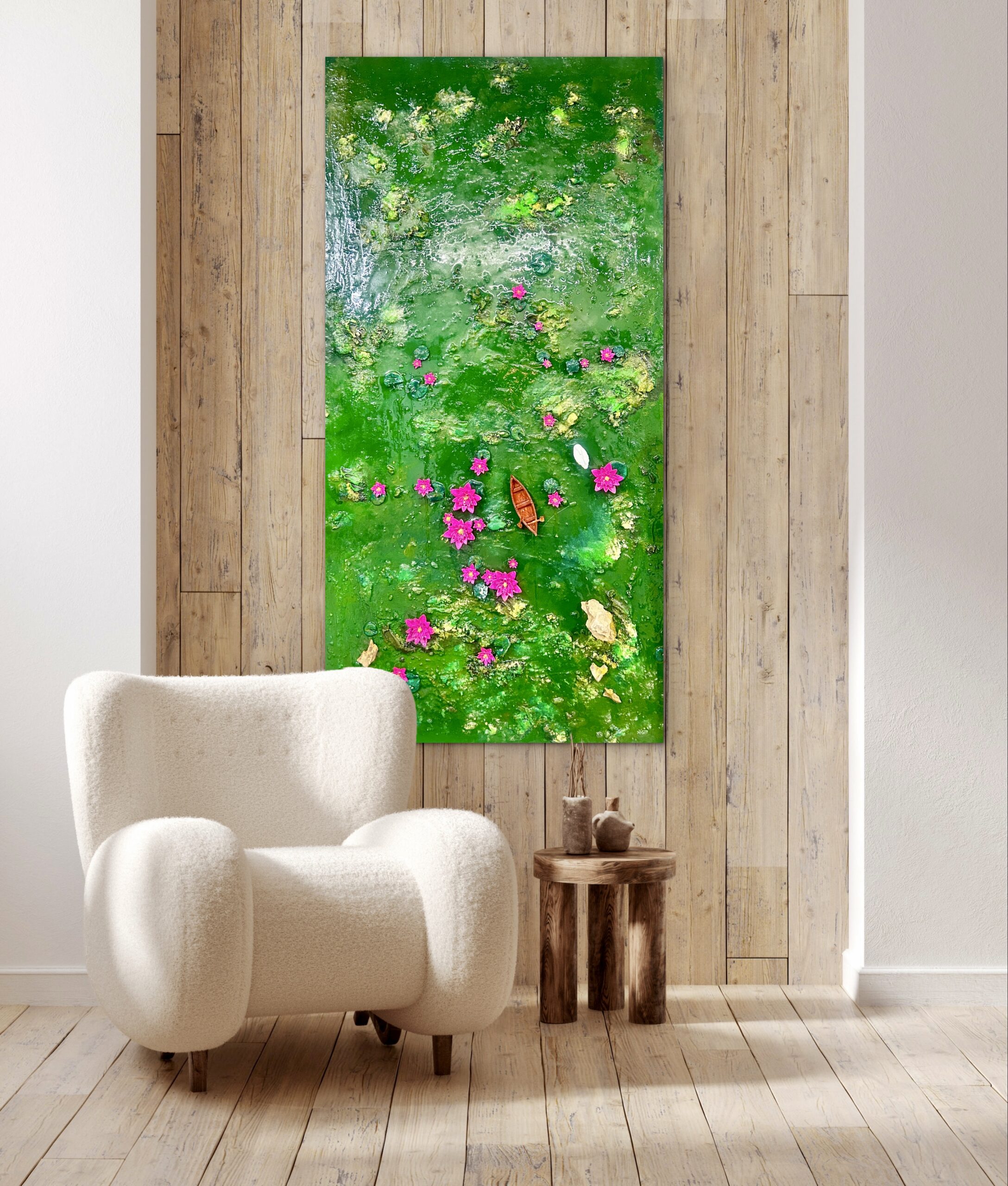 Featuring a beautifully crafted boat and layered floral textures, the artwork blends contemporary abstract expression with realistic natural elements, making it a striking statement for luxury interiors.