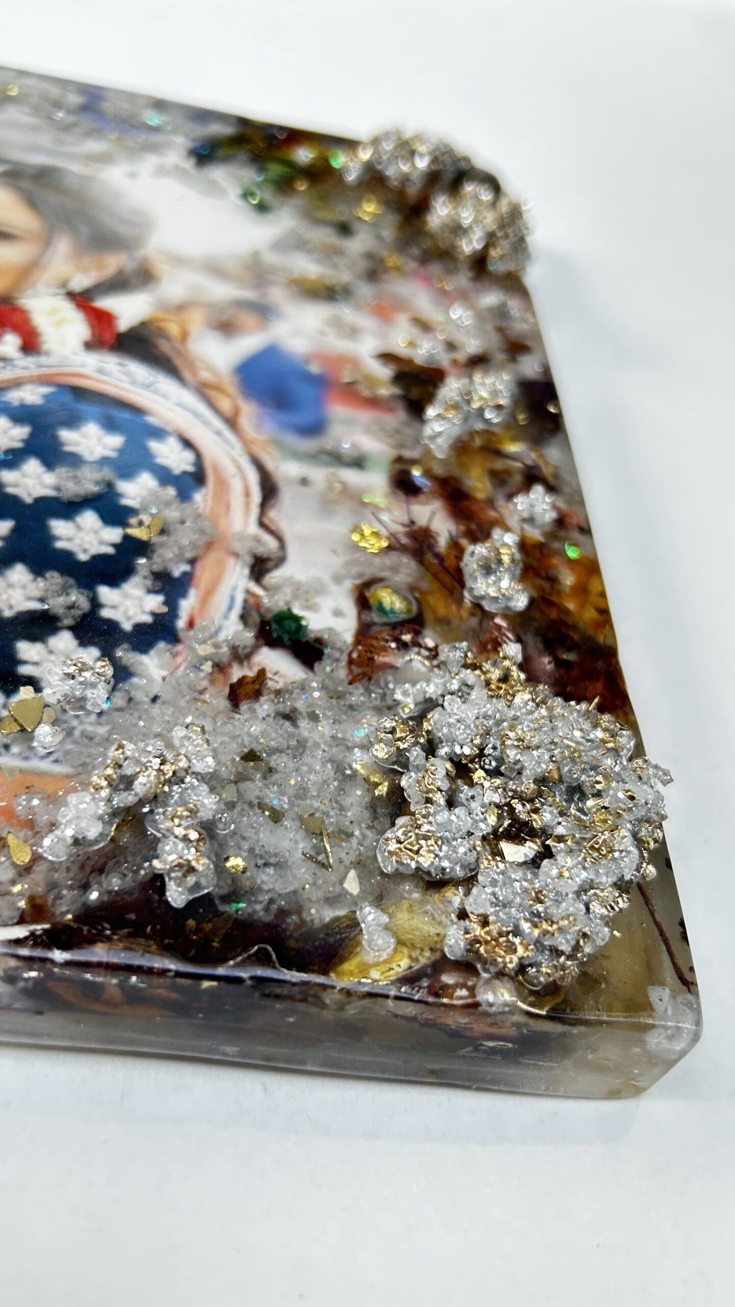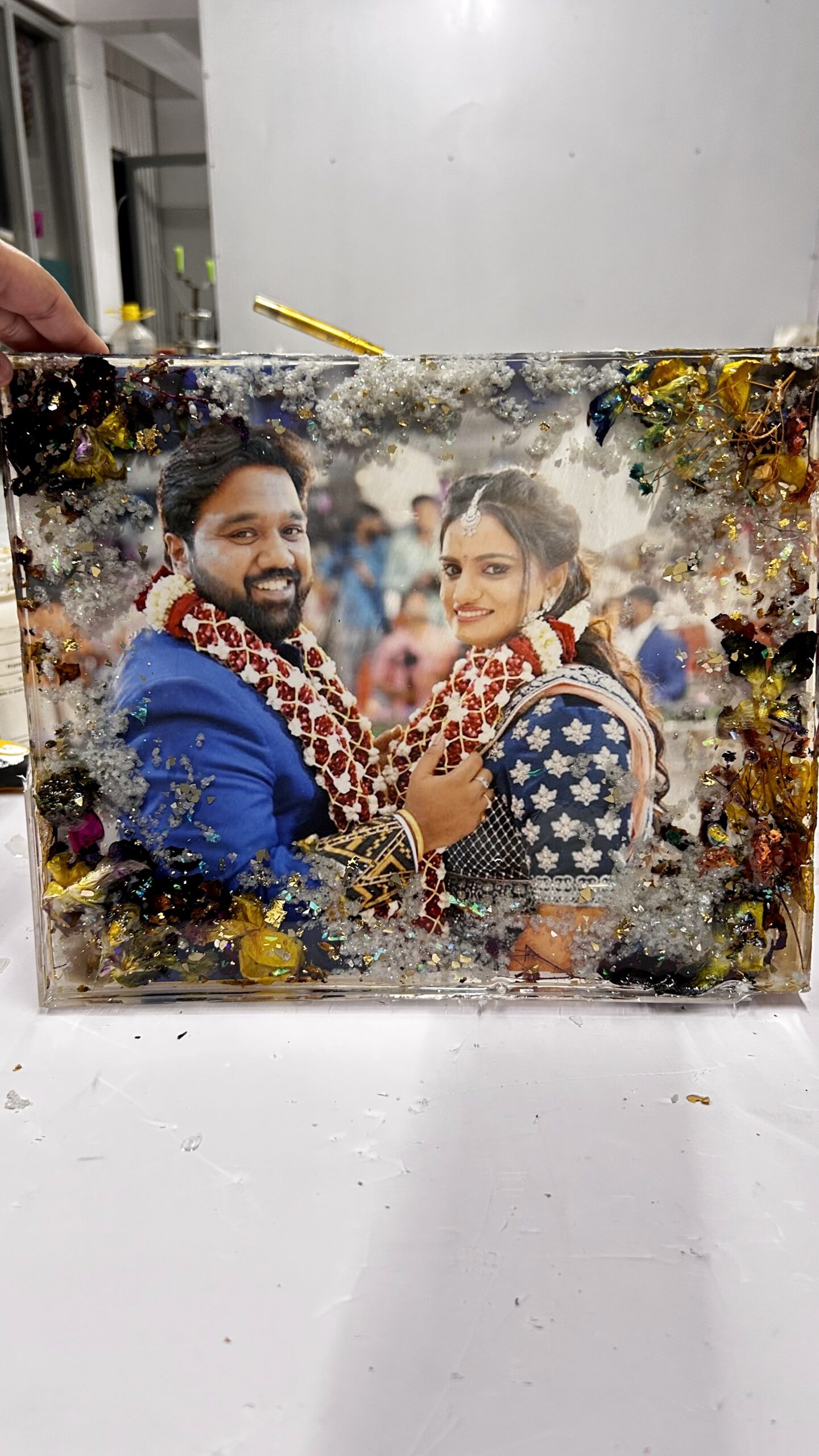 Celebrate your love story with a one-of-a-kind Couple Portrait Floral Preservation Frame, handcrafted using your real wedding florals and enhanced with a luxurious druzy crystal art effect. This bespoke artwork transforms your most cherished moments into timeless wall décor, blending preserved blooms, textured crystal details, and contemporary resin art.
