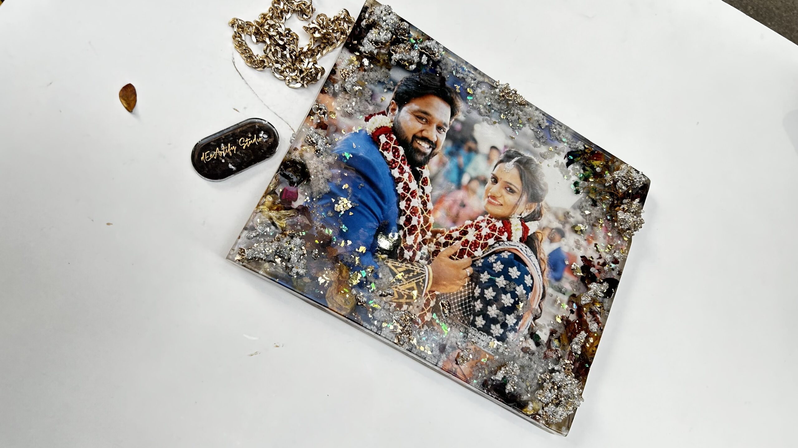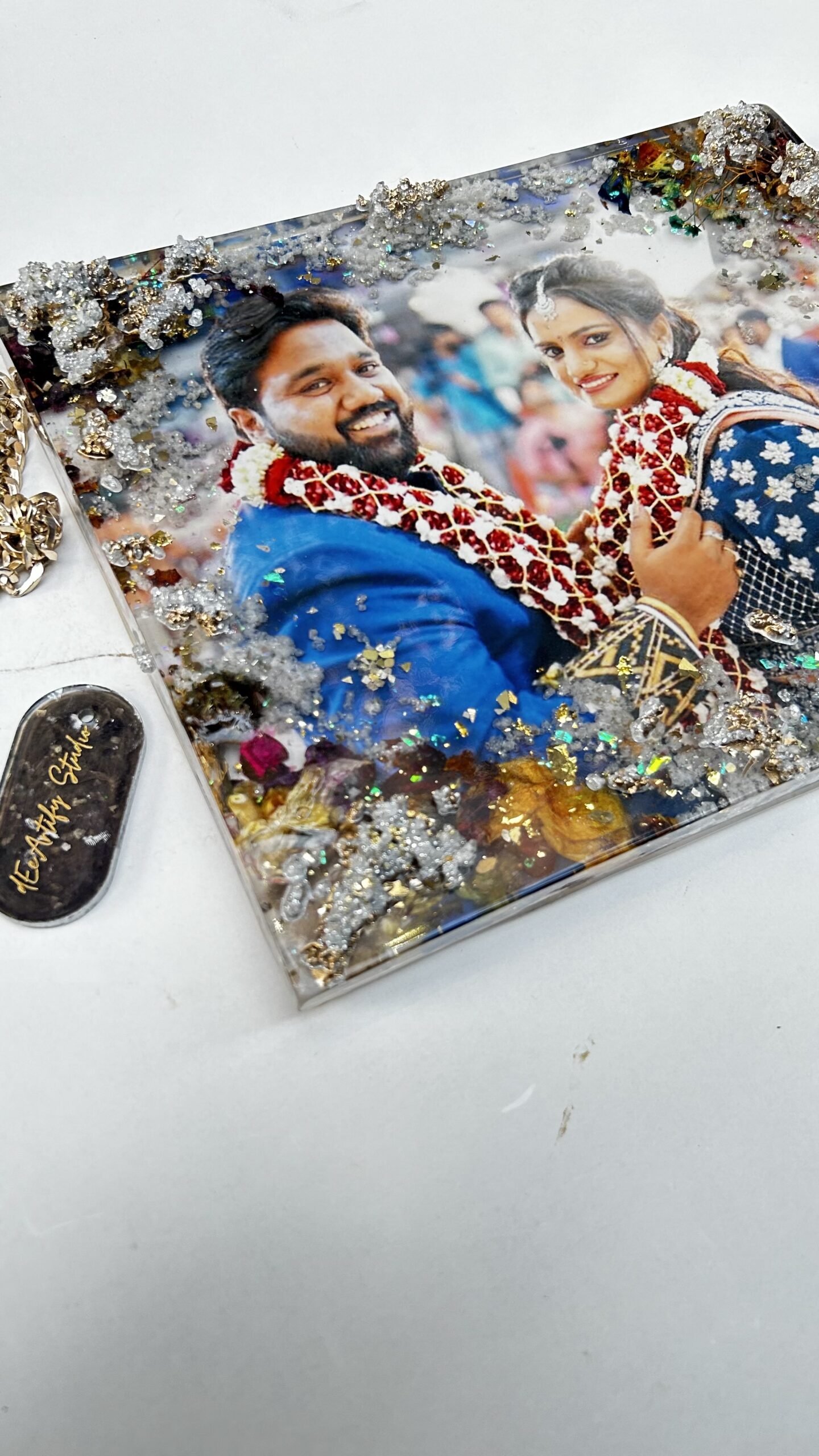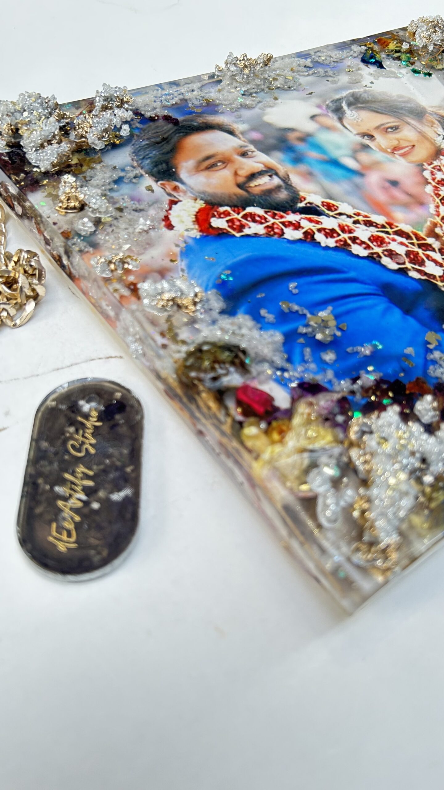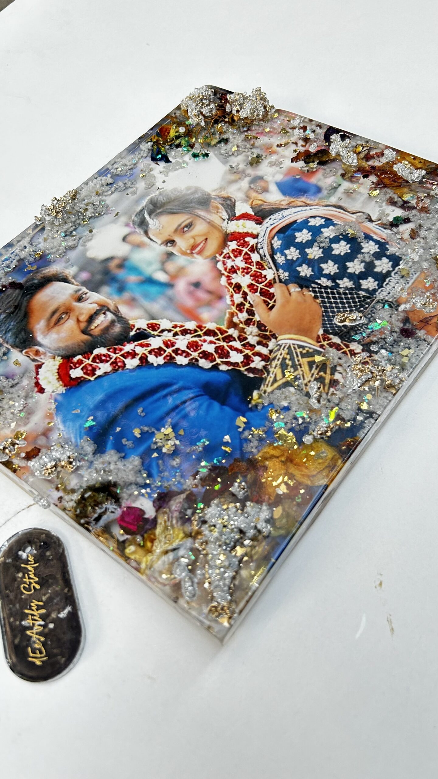 Each frame is custom-made to reflect your journey — your photo, your florals, your colors — elevated with shimmering druzy accents that add depth, elegance, and a touch of luxury. No two frames are ever alike, making this a deeply personal keepsake for couples who want their memories preserved as art.