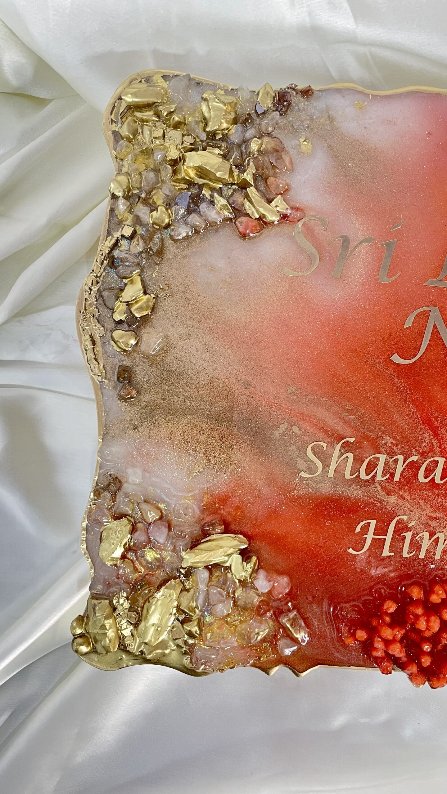 Make a powerful first impression with our Crimson Geode Resin Name Plate, handcrafted to bring bold luxury to your home entrance. Inspired by natural geode formations, this statement piece features rich red tones layered with crystal textures and metallic detailing, creating a dramatic, premium look.