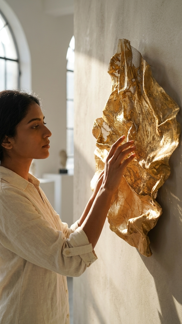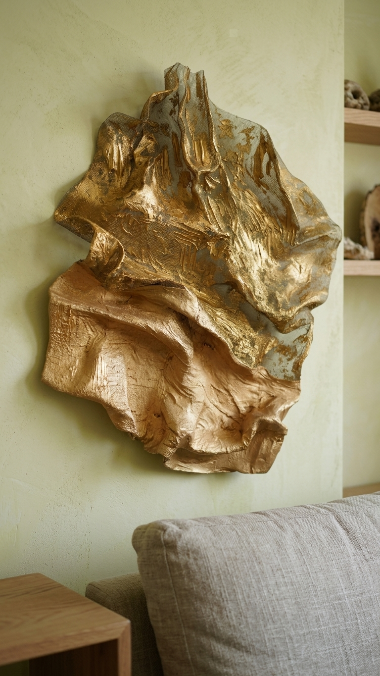 Golden Drift is a one-of-a-kind contemporary wall installation designed to transform interiors with depth, texture, and artistic luxury. Crafted uniquely using mesh art techniques, layered textures, and hand-finished gold gilding, this piece creates a sculptural presence that stands out beautifully in modern and minimalist spaces.