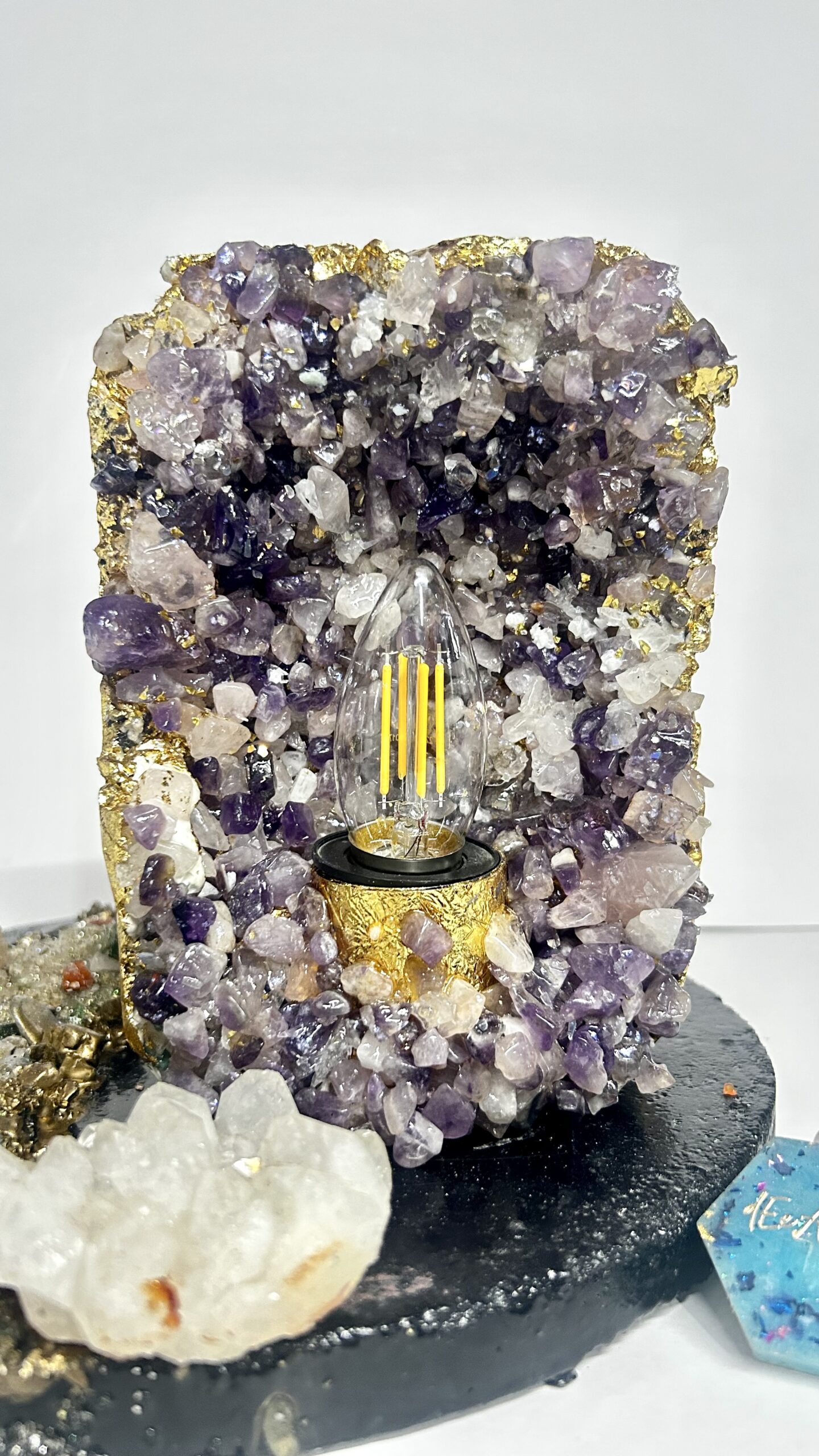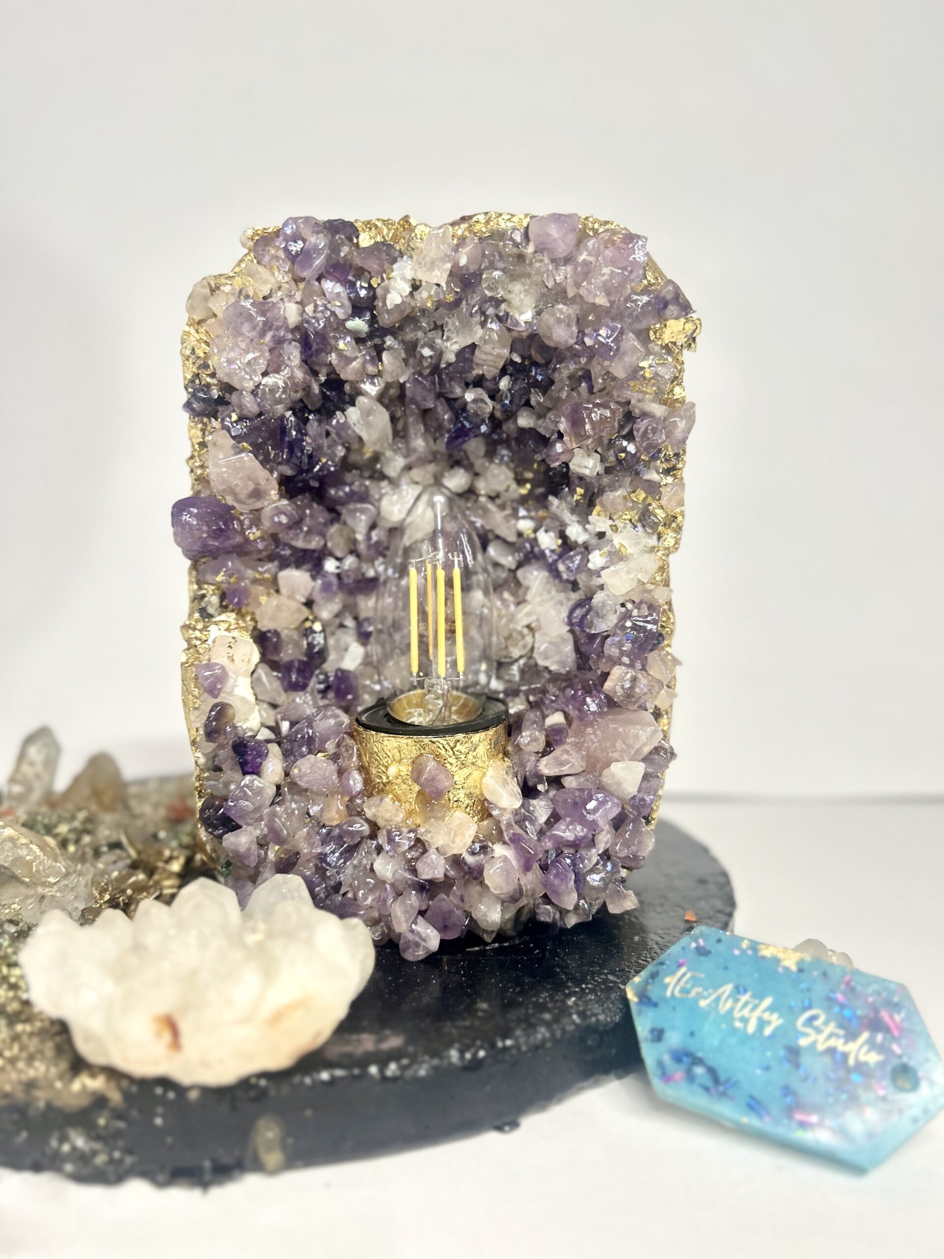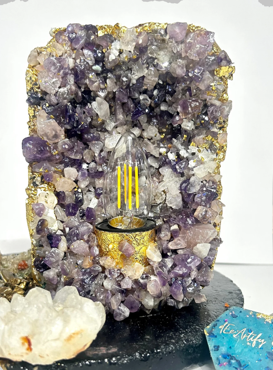 This handcrafted amethyst geode table lamp is a striking fusion of natural semi-precious amethyst quartz, textured concrete, and premium resin detailing. Each crystal is individually placed to form an organic geode formation, enhanced with subtle metallic accents that reflect light beautifully. The warm filament glow illuminates the natural textures of the amethyst, creating a calming yet luxurious ambience.