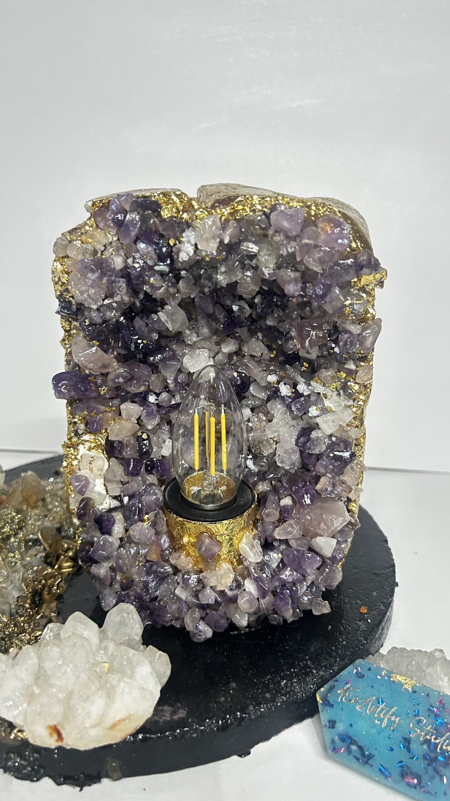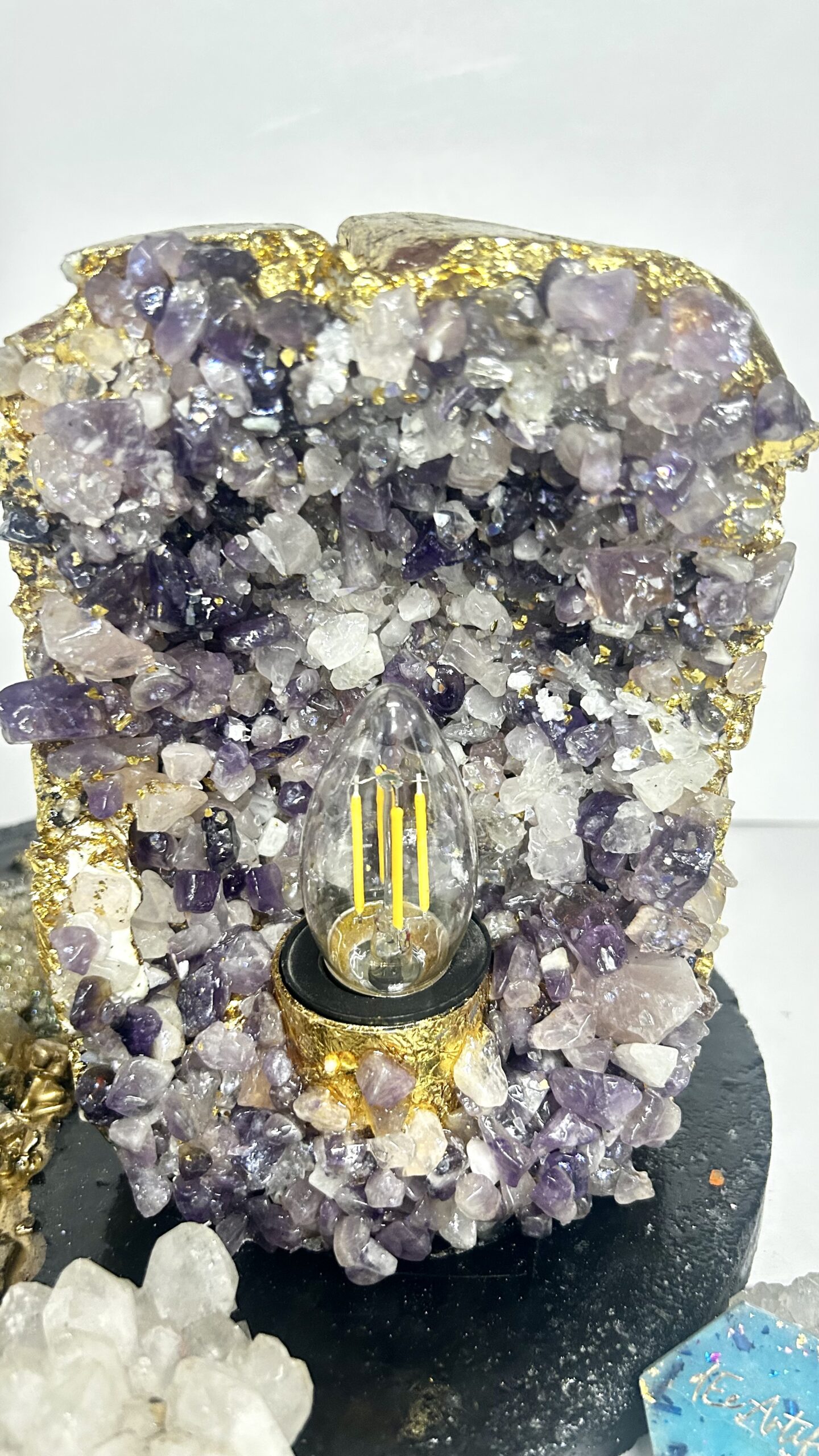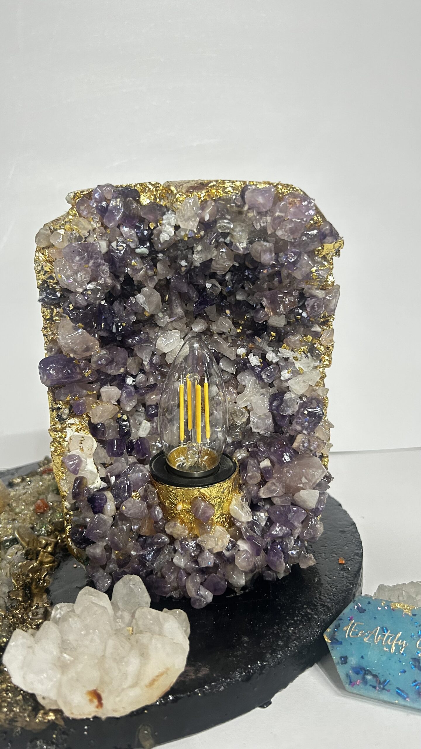 This handcrafted amethyst geode table lamp is a striking fusion of natural semi-precious amethyst quartz, textured concrete, and premium resin detailing. Each crystal is individually placed to form an organic geode formation, enhanced with subtle metallic accents that reflect light beautifully. The warm filament glow illuminates the natural textures of the amethyst, creating a calming yet luxurious ambience.