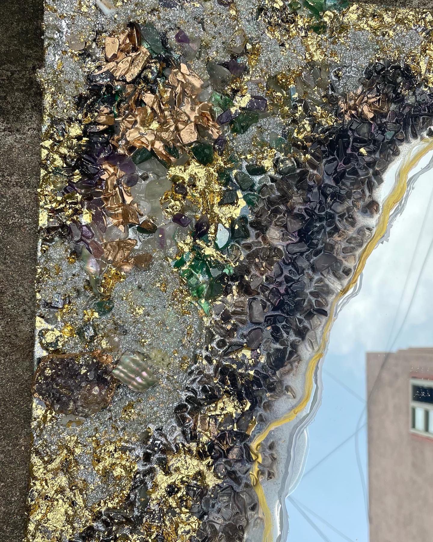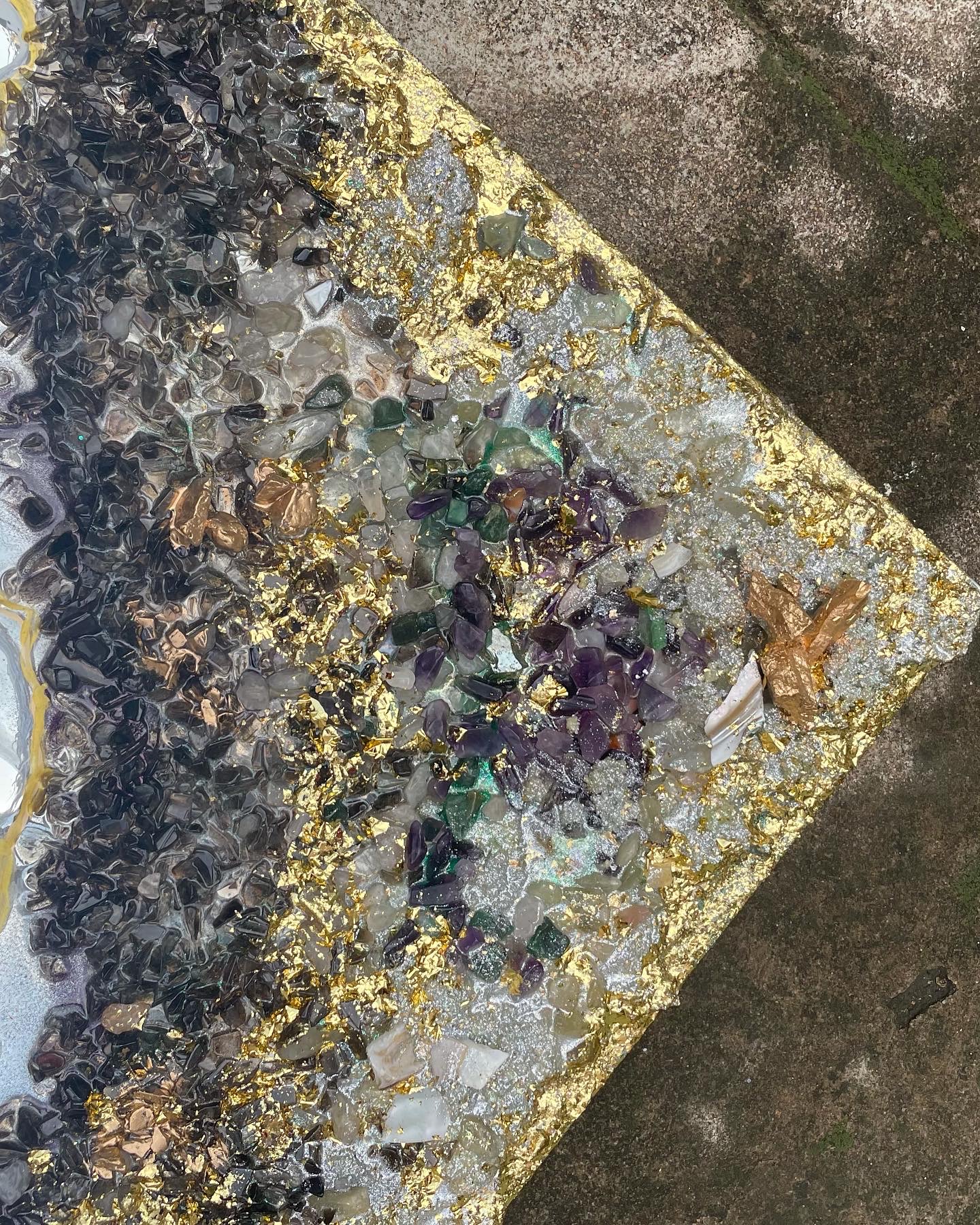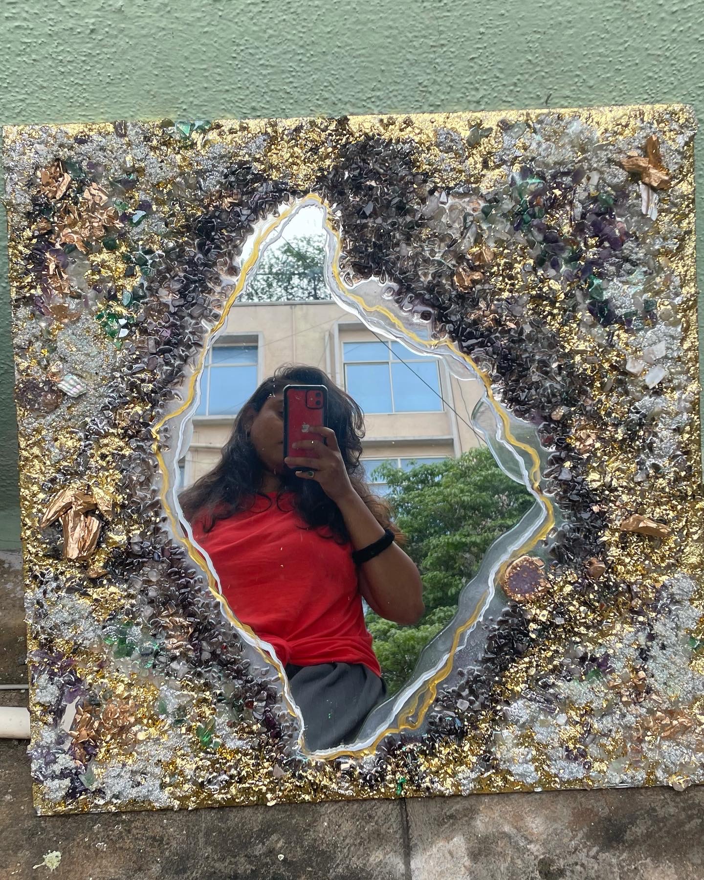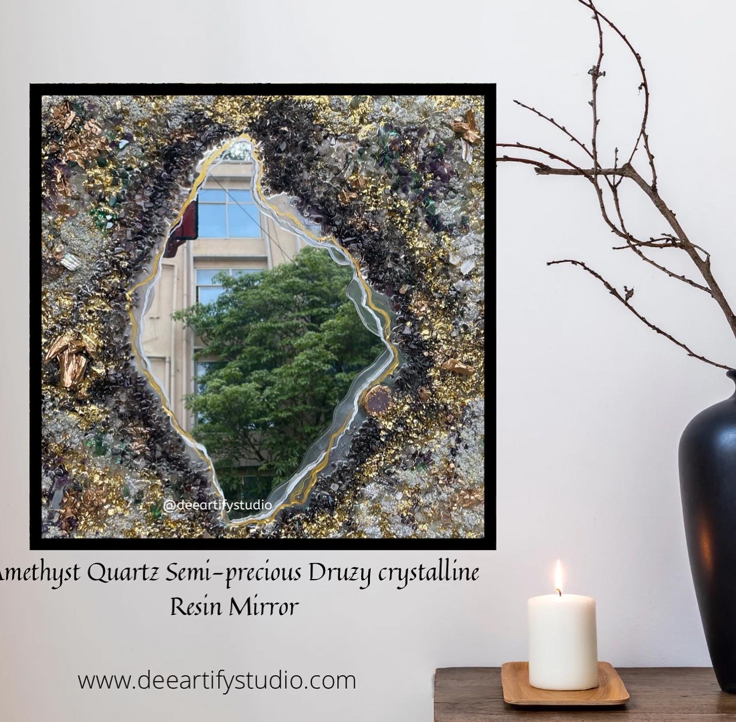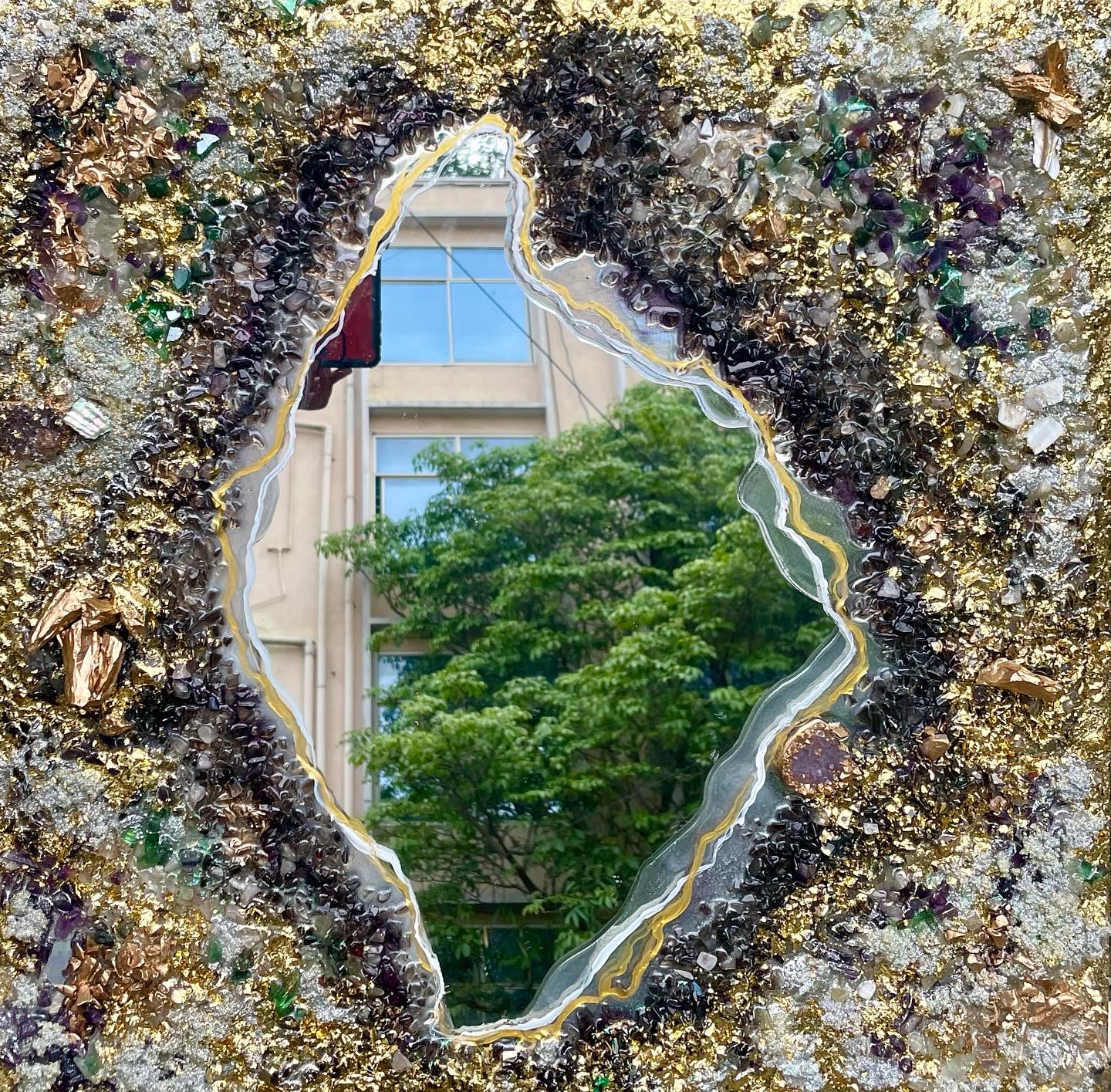 - Handcrafted geode-style resin art mirror