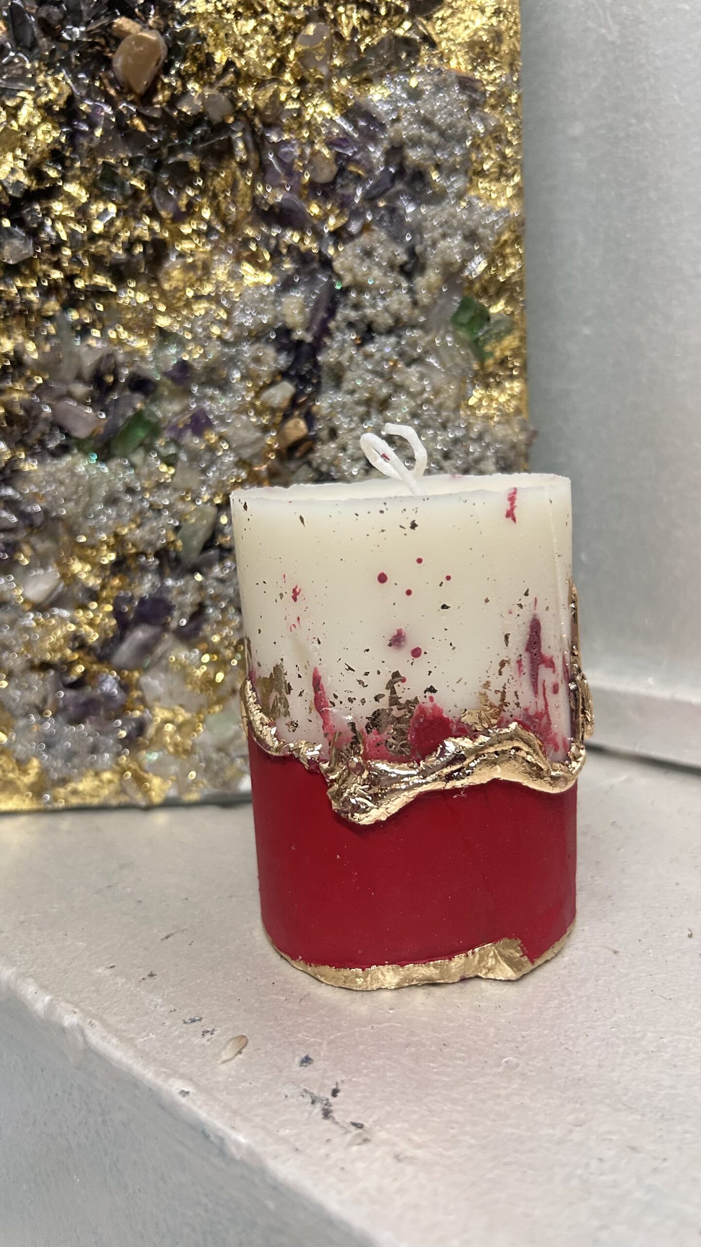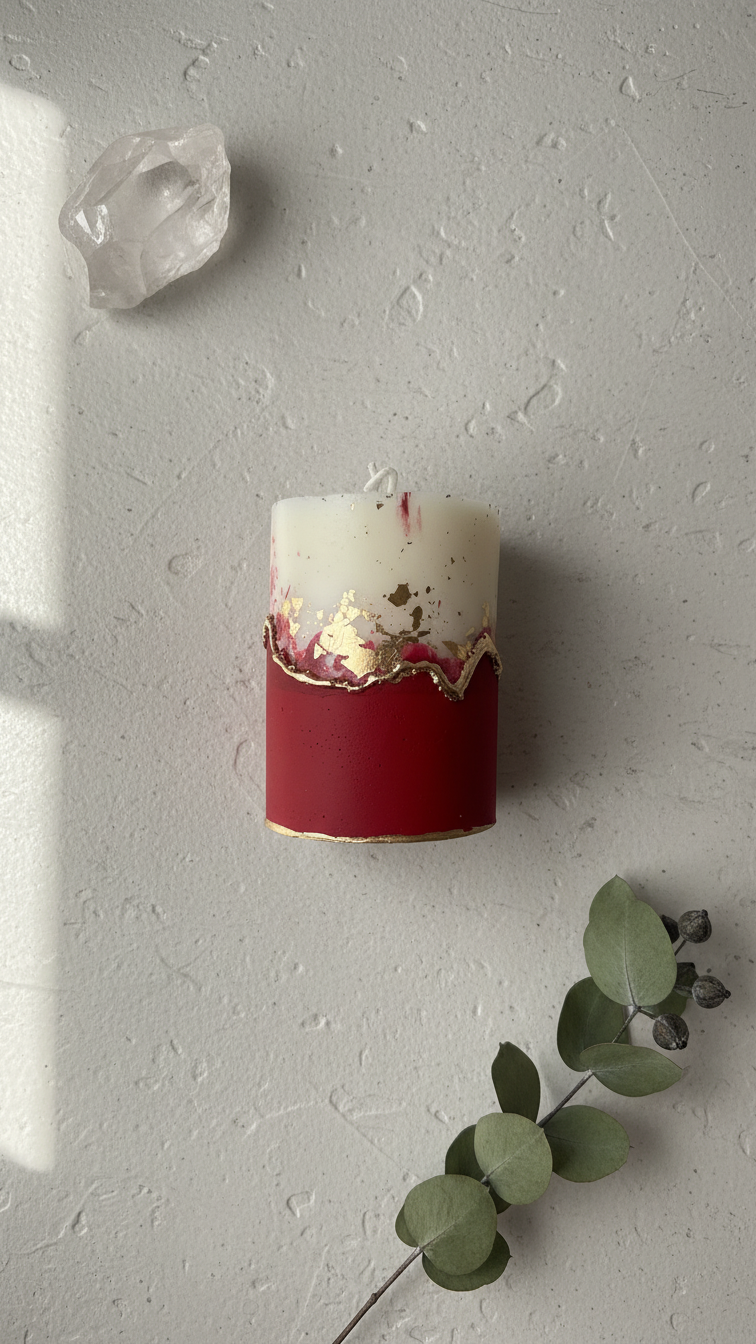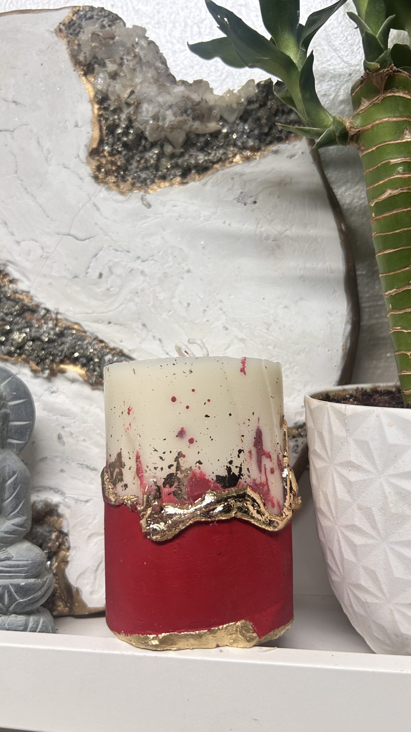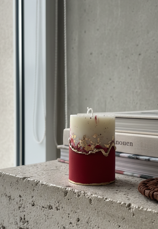 The Scarlet Luxe Handcrafted Candle is a statement piece crafted for intimate, elegant spaces. Featuring a rich crimson base, soft ivory wax top, and hand-finished gold-leaf detailing with an organic molten edge, this candle blends minimal luxury with artistic charm.