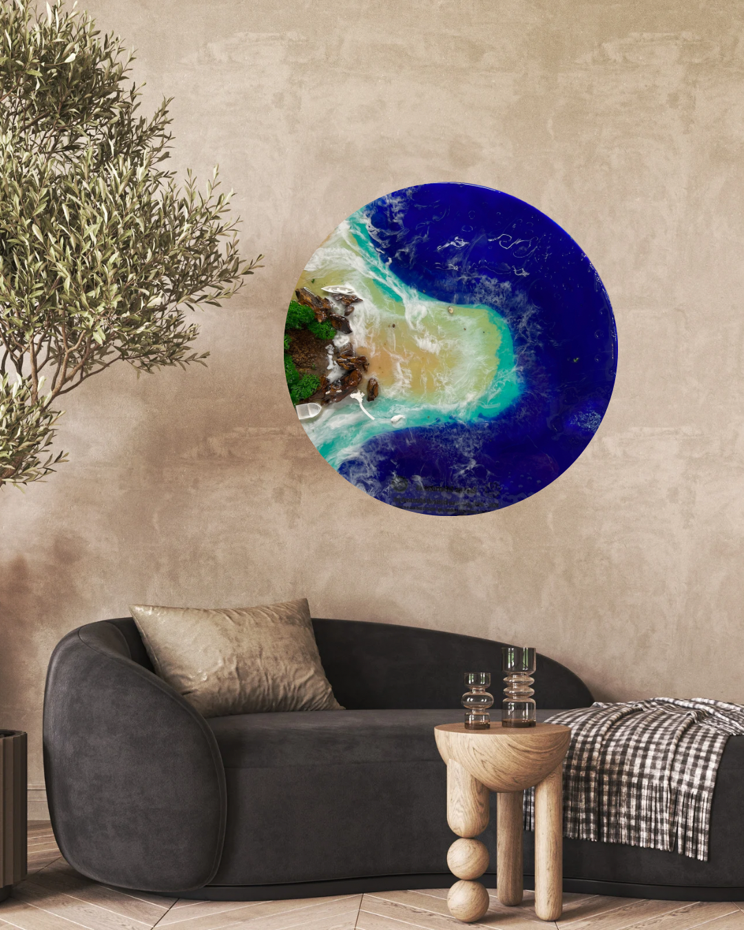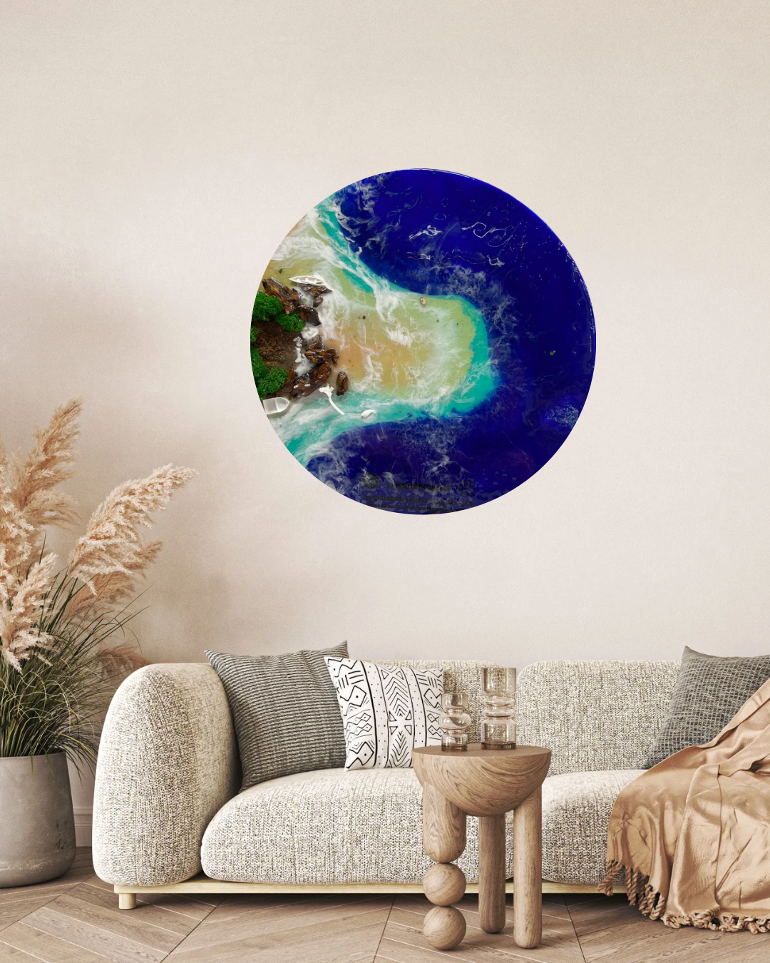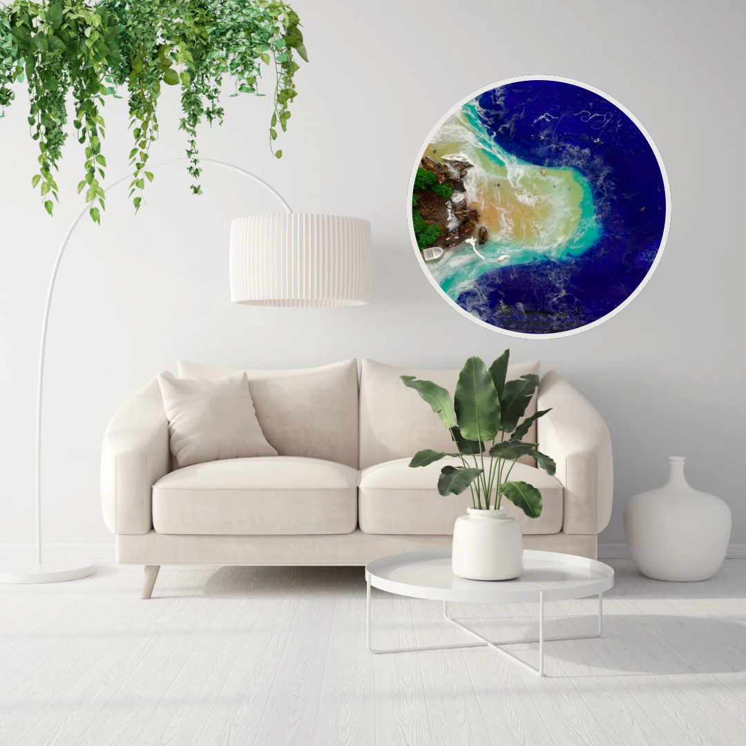 The Serene Shore Ocean Resin Wall Art captures the beauty of a secluded shoreline in rich ocean blues, turquoise waters, and natural sandy tones. Handcrafted in layered resin with realistic wave textures, this round statement artwork brings depth, movement, and a calming coastal energy into your space.