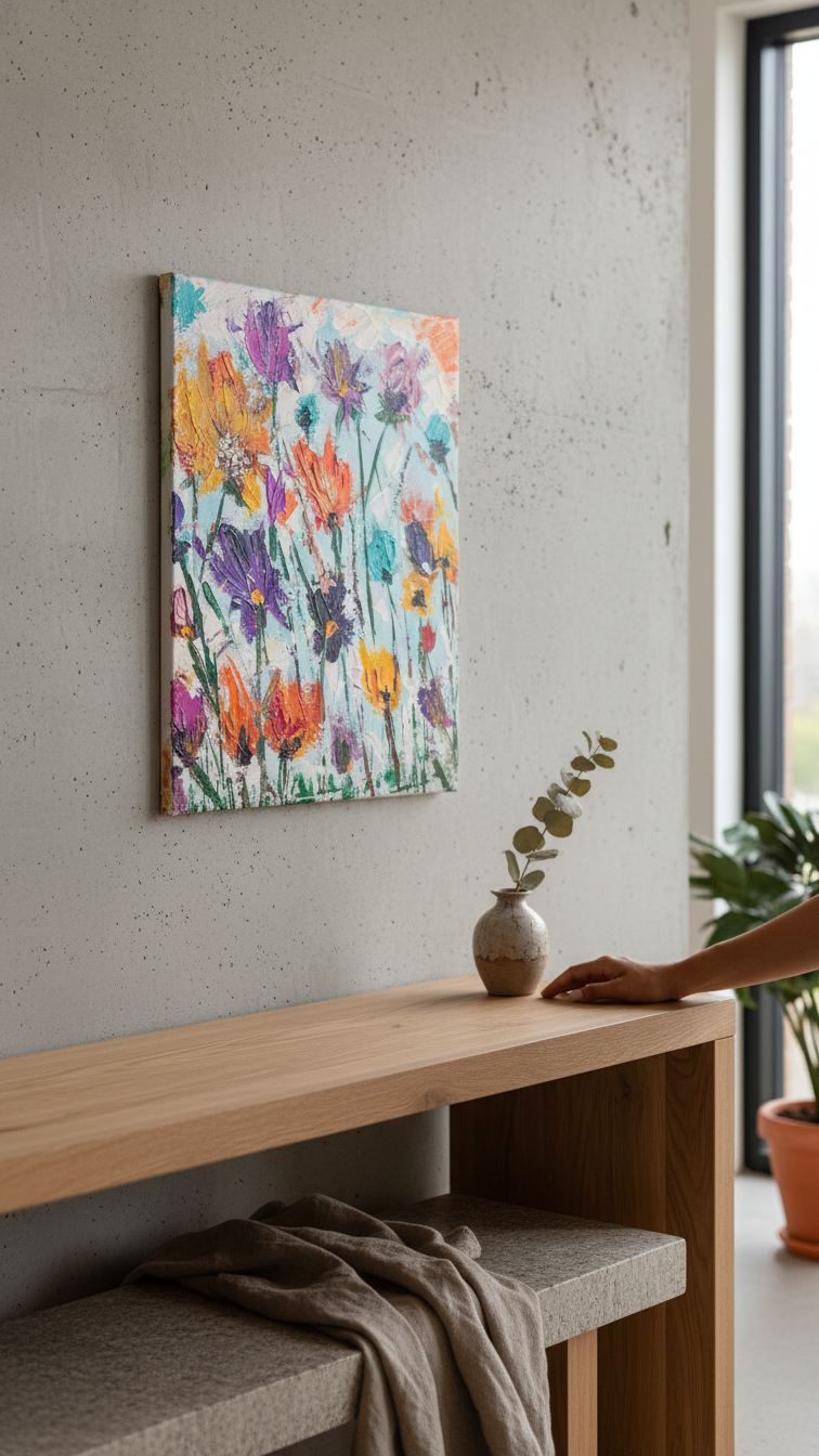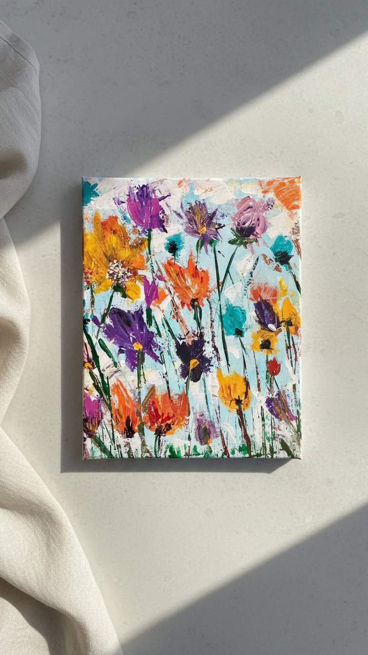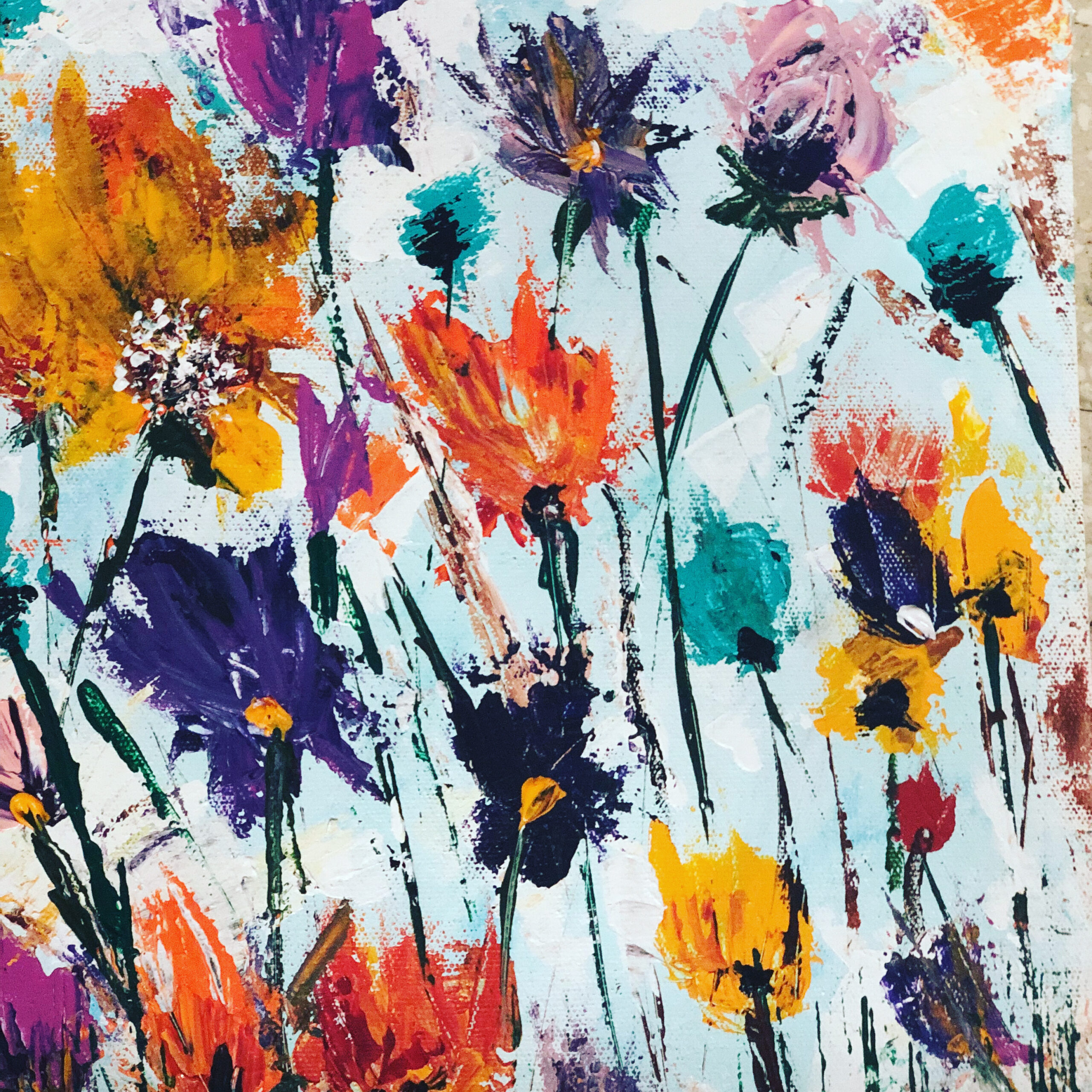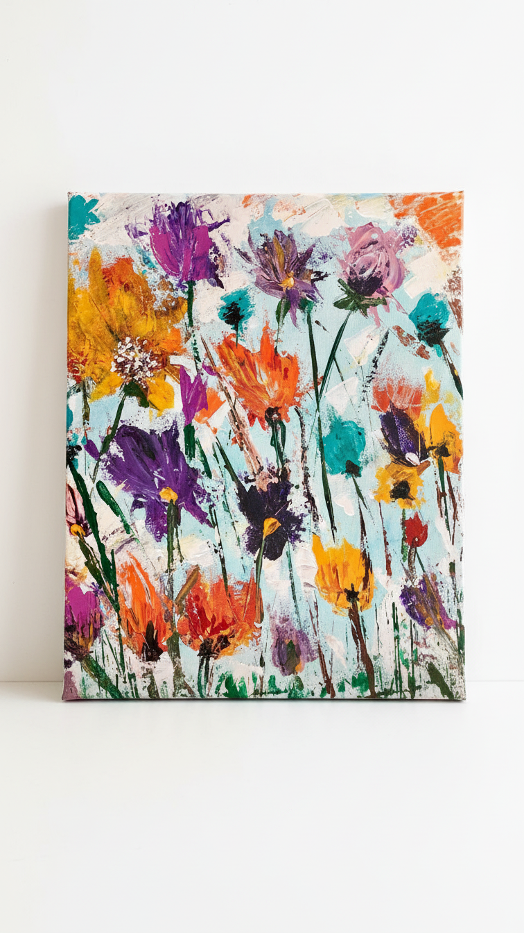This spring-inspired abstract floral painting captures the vibrant energy of a garden in full bloom. Bold brush strokes, playful splashes of color, and expressive florals bring a sense of movement and happiness to the canvas.